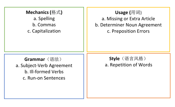 ③其他常错内容:Mechanics(格式)和Usage(用词)的分类需要更多的关注,学生