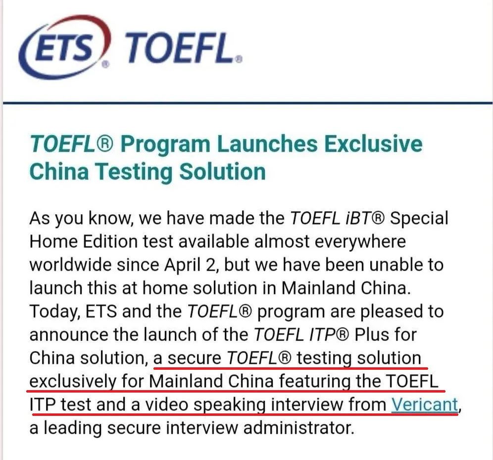 ETS将在大陆推出TOEFL ITP Plus考试,应对疫情期间TOEFL IBT 无法正常进行的状况。这一考试将持续至托福在大陆复考。并将于5月15日开启报名。