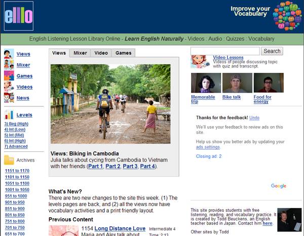 Elllo是一个标准的英语听力网站,网站上有超过1400个听力课程。网站的创立者是一位在日本教英语的老师,每周他会上传2个新的视频到网站上,视频来源于世界上各个国家不同口音的人。