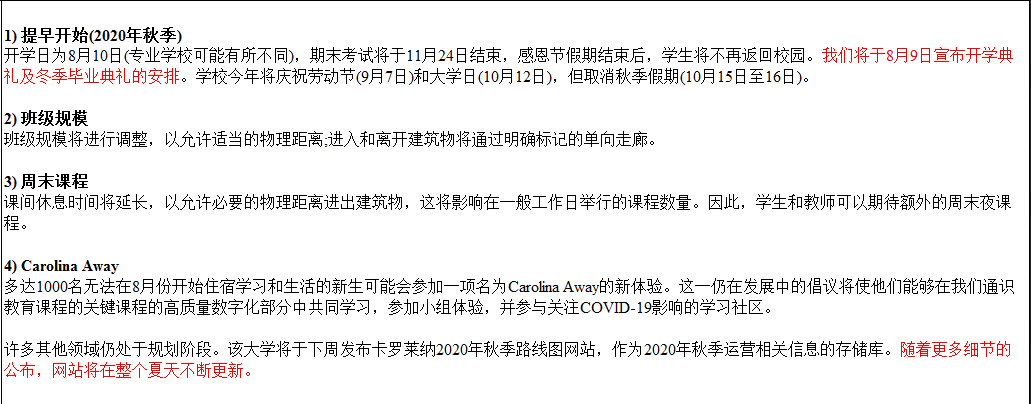 以下是美国大学2020秋季开学政策汇总:北卡罗来纳大学教堂山分校(截止6月12日):