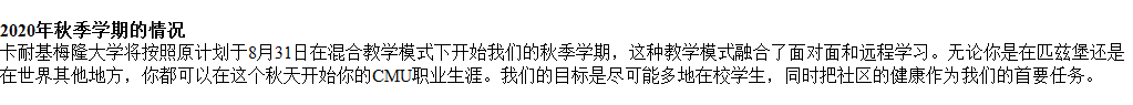 以下是美国大学2020秋季开学政策汇总:卡内基梅隆大学(截止6月12日):