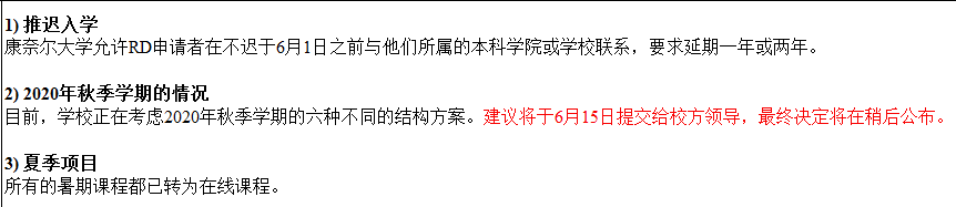 以下是美国大学2020秋季开学政策汇总:康奈尔大学(截止6月12日):