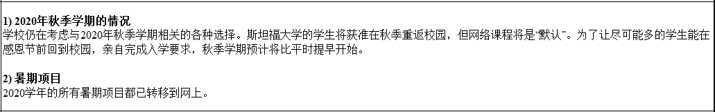 以下是美国美国大学2020秋季开学政策汇总:斯坦福大学(截止6月12日):