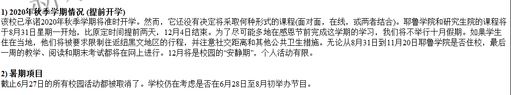 以下是美国美国大学2020秋季开学政策汇总:耶鲁大学(截止6月12日):