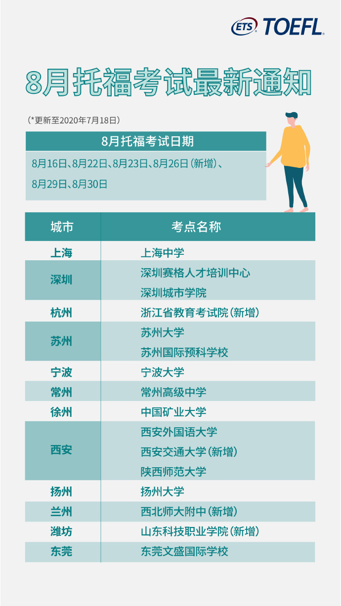 托福官方最新确认,8月托福iBT考试新增恢复以下3个考点:北京私立汇佳学校、北京外交人员服务局、国试考试中心。