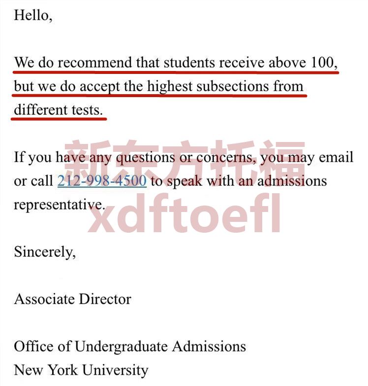 在回复的邮件中,纽约大学明确表明本科申请接受托福拼分成绩,推荐总分不低于100分。
