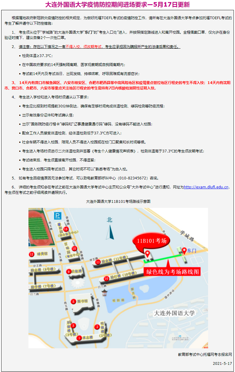 托福考试大连外国语大学考点疫情防控期间进场要求