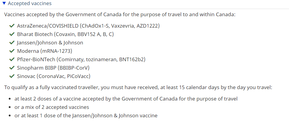自2021年11月30日起,加拿大移民局宣布,承认所有世界卫生组织批准(WHO)的疫苗,中国生产的国药和科兴疫苗也在列表当中。