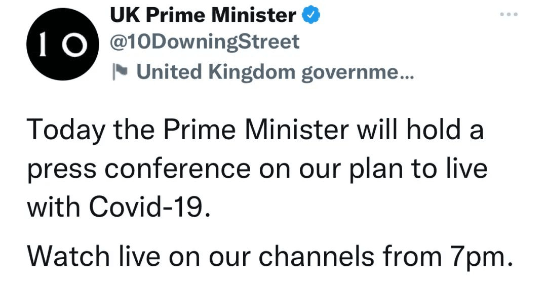2月21日,英国首相鲍里斯举行疫情新闻发布会宣布“LIVING WITH COVID”的计划:自2月24日起,将解除英格兰地区所有疫情防控措施。