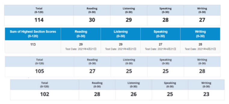 原因是听力的能力还需要支撑口语和写作的综合部分,几项一起努力才能突破100分这个坎。如果听力达到30分,总分一般能到105或者110分以上。