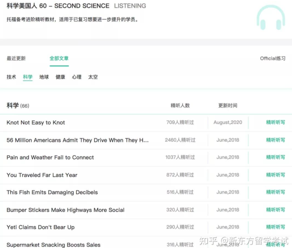 3)平时注意磨耳朵,也就是听一些英文原版的录音。比较推荐科学美国人,跟托福考试的话题相关性比较强,http://tpo.xdf.cn上面也可以直接用,平时可以把听音乐的时间分配出来听这个素材,这样就能够塑造出一种英文环境。