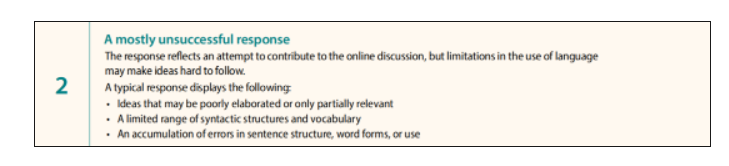 2分:文章几乎无法成功地回应题目,虽然尝试对学术讨论做出补充和贡献,但有限的语言应用能力会导致文章内容难以理解。