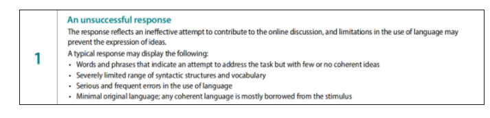 ·尝试使用词汇和短语去回应任务,但是几乎没有或完全没有连贯的观点表达,句式词汇的使用极其有限;