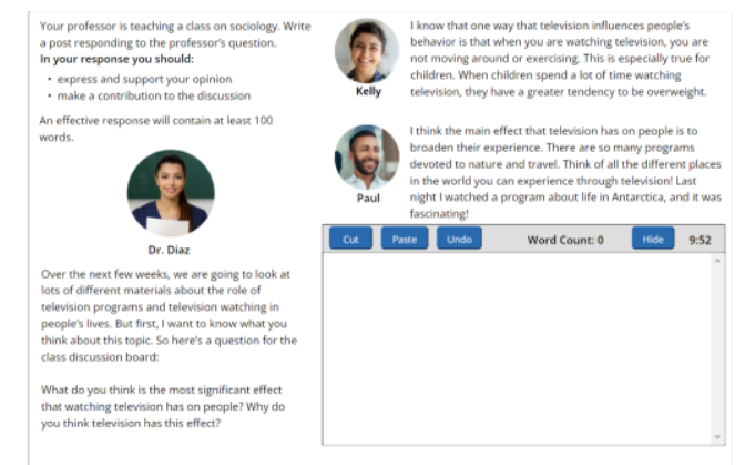 该试题会模拟线上课堂讨论,要求考生针对指定话题阐述观点并提供论据。时间限制10分钟,需要学生阅读材料后,完成一篇约100词左右的回答。