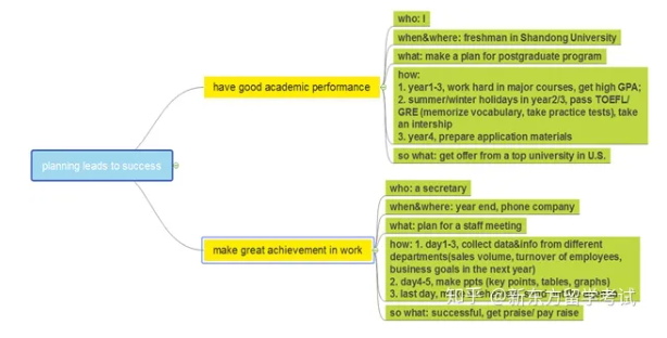 所以,学生在找论点的同时,要考虑能否想出相关的具体事例。还是以刚才的人生品质类题目一为例:“做计划”的好处分别体现在学习和工作上,那么下一步就是在每个场景的例子中给出5w1h的细节,即在什么时候(when)、什么地方(where)、什么人(who)怎么计划某件事的具体步骤或时间安排(how & what),最终获得了什么样的成功(what)等。该题的详细提纲如下: