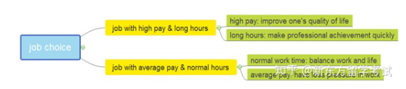 而实际上,题目中的两种立场有“and”并列的两个因素(薪水和工时), 学生可以拆解这两点以给出各自的好处,如选择前种工作,一是高薪能提升生活质量,二是长工时带来更快的职业成长;选择后种工作,一是有时间去娱乐社交,二是薪水少意味着工作压力小。