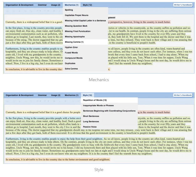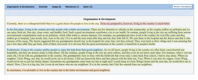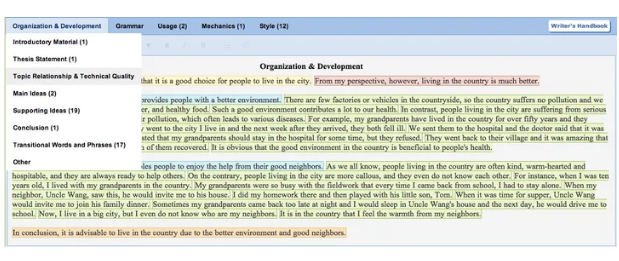 在上图中,我们可以看到系统将考生的文章进行了不同色块的标注,每个色块代表着文章的不同成分(开头段的黄色表示background information,红色表示thesis statement;中间段蓝色表示topic sentence,绿色表示supporting information;结尾段橙色表示conclusion)
