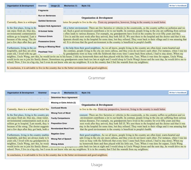 Language Use这个维度是E-rater最擅长的,因为它可以通过对考生的语言表达进行数据分析,并匹配以往数据库里的语言数据,从而对考生的文章语言质量进行审核。在语言层面,E-rater会从以下四个角度去审核: