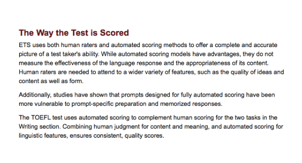 当考生完成托福考试后,作文部分(包括综合写作和独立写作)的分数将由接受过ETS培训的老师和E-rater共同批改(见下面官网截图,截图来源:https://www.ets.org/toefl/ibt/scores/)。在批改过程中,机器和人工独立评分,互相不知道彼此的分数,人和机器的评分范围都是0-5分,最终系统会对这两个分数进行加权平均。值得一提的是,为了保证分数的公平有效,人工给分和机器给分的误差不得超过1分(如人工给出3分,机器给出4分为正常;人工给出2分,机器给出4分则为异常分数);若两者分数误差超过1分,将由ETS的专业阅卷者进行再次评分。