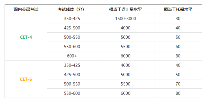 下面是一个仅供参考的四六级分数和托福分数对照表,具体到了各个分数区间,大家可以估计自己目前处于怎样的分数段,以及距离目标分数还差多远~