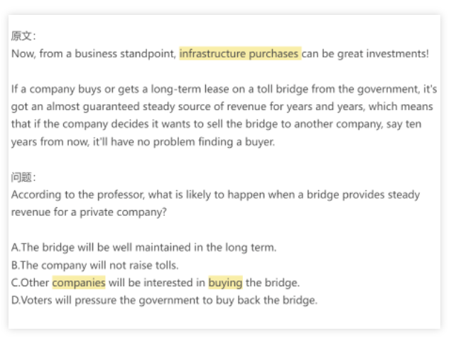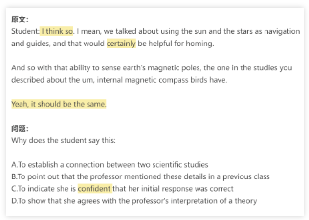 本题答案对应重听段落的第一句,听到后同义转换可得出正确答案选择C选项,