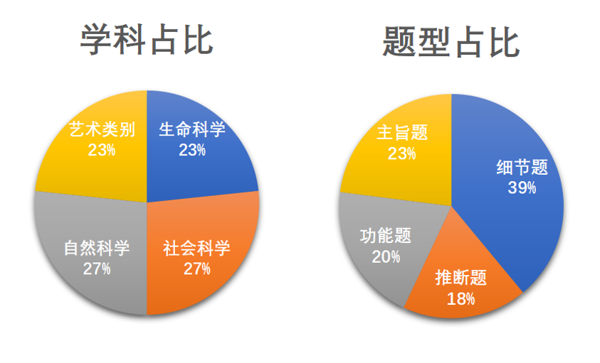 研发团队在设计题库时,主要参考官方已给出的大类别话题标签:艺术,社会科学,自然科学,生命科学。题型方面重点参考托福历年数据偏好,细节题占据较多比例,其次为主旨题等。