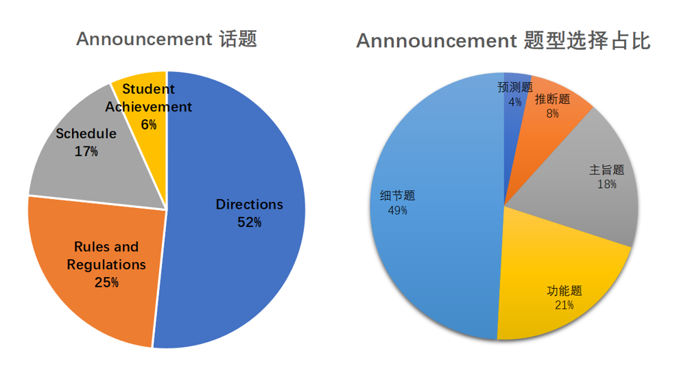 Announcements题型:依然要强化相关校园通告类常用词汇和常见句子;其次,熟悉“must/should/need to” 等指令词与动作的对应,确保能够抓提示词和细节要点。