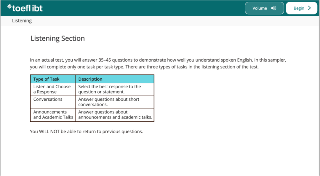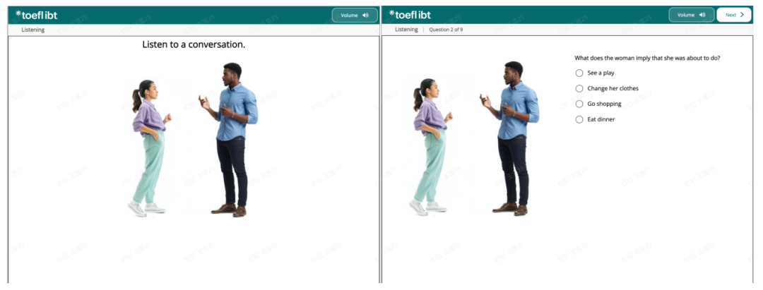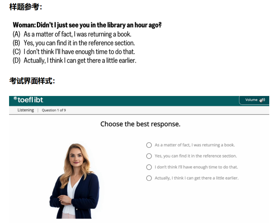 新版托福听力考察了四种题型,分别是Listen and Choose a Response选择对问题或陈述的最佳回答,Conversations回答日常听力短对话的相关问题,Announcements校园生活的广播通告,以及Academic Talks回答学术听力的相关问题,与现行托福考试听力内容相似、篇幅更短,我们逐一展开题型解析: