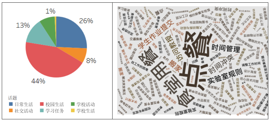 基于官方对于该题型的官方定位和托福往年数据分析,研发团队在设计题库时,主要采用的话题标签为: 日常生活,社交生活,校园设施,学校生活,学习任务,学校活动等。根据以往数据,加大了校园生活话题的选取。在热点内容方面,参考官方已放的样题,增加餐饮比重。