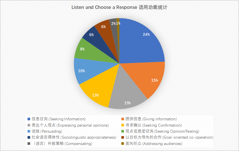 基于官方对于该题型的定位和CEFR体系,研发团队在设计题库时,采用CEFR框架当中语用功能的标签作为元数据体系,在题库设计中充分考虑以下几大方面: