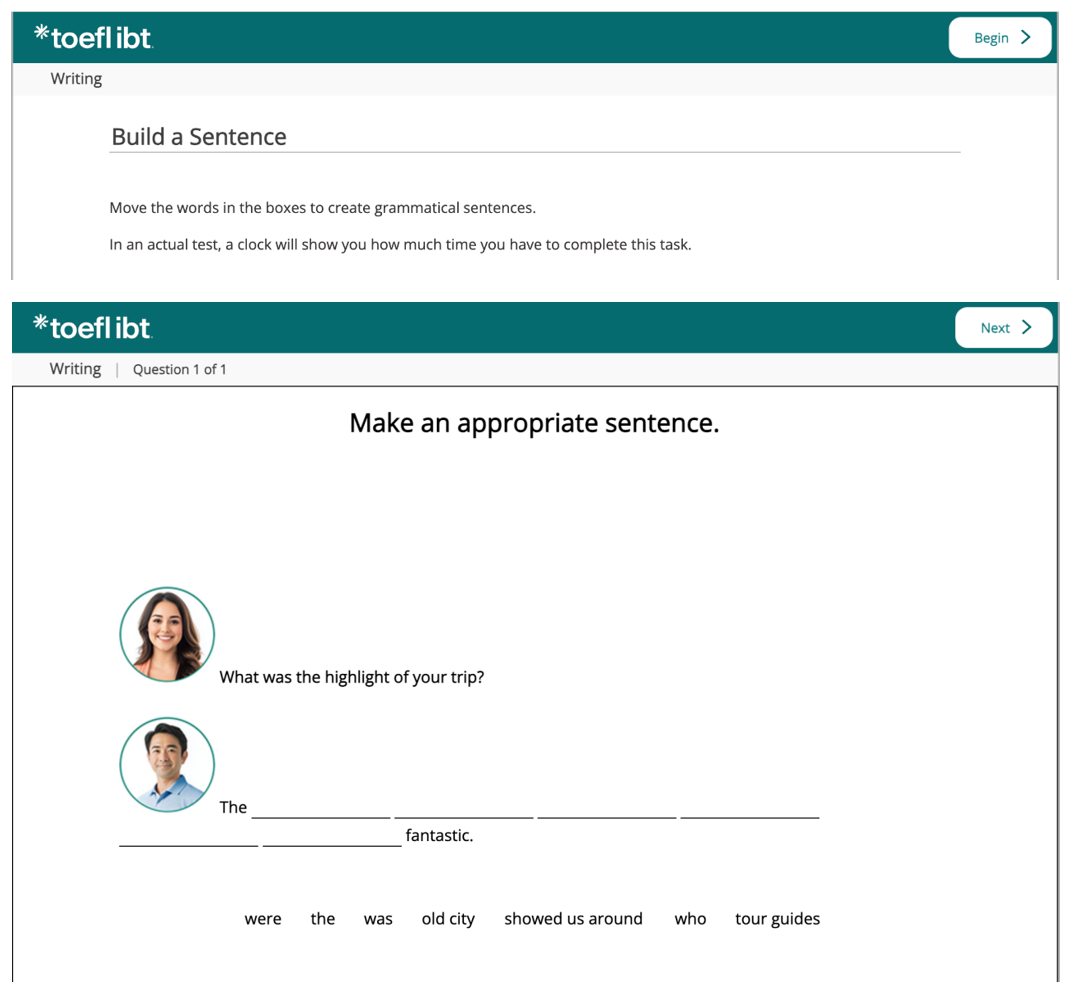 在Build a Sentence任务中,考生需重组乱序的单词或短语,形成合乎语法的陈述或疑问句,评估其对句式结构的掌握程度。每题包含两句话,一句提供背景信息,另一句需重新排序。话题如实验室、办公室、课堂等场景,涵盖日常生活与学术背景。