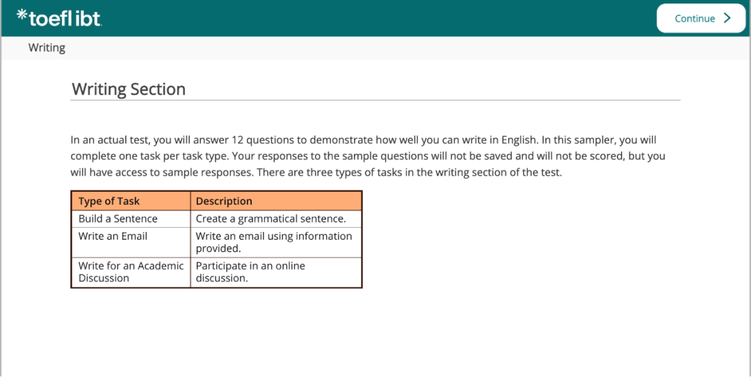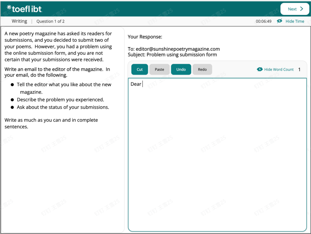 1.题型介绍:考生需根据学术或社交情境在7分钟内撰写一封邮件,如提供建议、发出邀请或解决问题。考察书信和社交规范,以及其他语言能力,包含用词,语法等;包含简略背景介绍,部分题目可能会配有背景解释或者图形。之后提出三条具体写作指令,明确交际目标。
