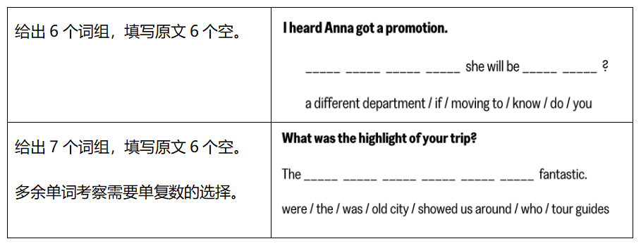 Build a Sentence题型:集中考察语法知识。熟悉常见句法结构,尤其是疑问句等特殊句式表达;此外也要熟悉词法规范,例如动名词、单复数问题等。