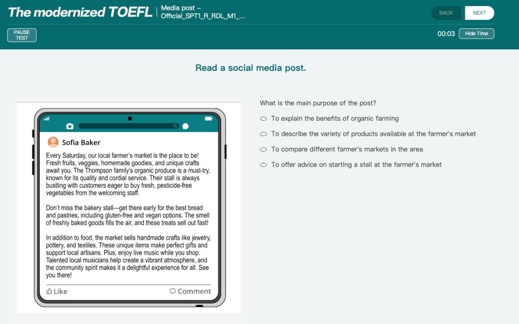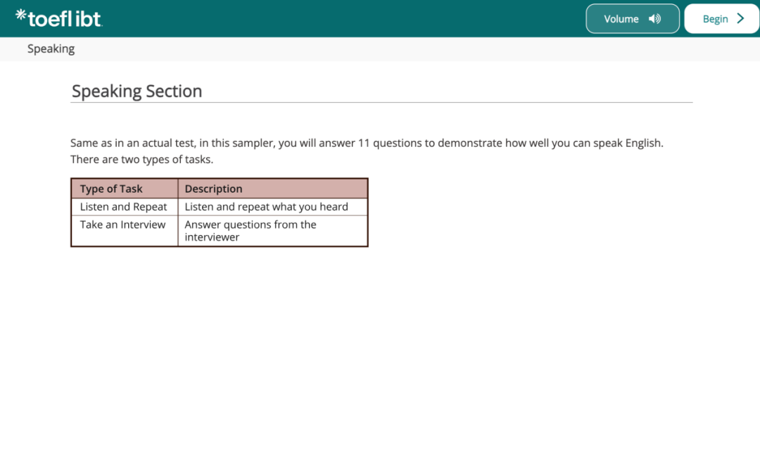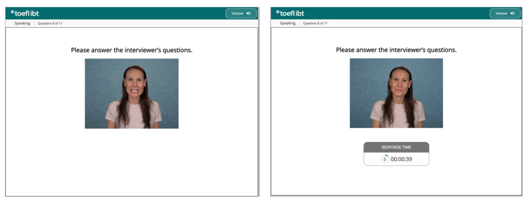 新版托福口语考察了两种题型,分别是Listen and Repeat复述所听句子,Take an Interview回答面试者问题。此次托福改革口语科目变化显著,核心转向实用交际能力考查,去掉了现行托福口语中听学术短篇而后复述的环节,本质上弱化了学术型阅读听力融合口语的综合能力考察。不过托福口语的综合性考察仍然存在,只是更为聚焦于日常口语场景,例如Task 1的日常生活场景看图跟读,Task 2中听面试官问题并回答一系列问题等。