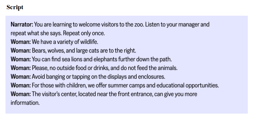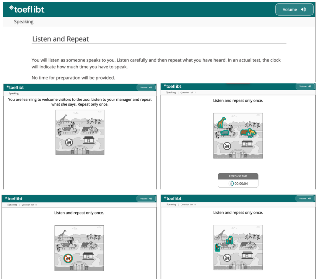 旨在考查考生对听到的句子进行理解,并准确、清晰复述的能力。在该题型中,考生需复述7个句子。话题上,官方说明为学术或者校园生活场景,但样题中包含参观动物园、“Listen to your manager” 等指令,预计实际考题会包含常规日常生活场景。此外,每组句子配有场景的视觉呈现,句子推进时,屏幕上对应的插图部分会同步动态变化,场景会为听力和复述提供明确的交流目的。每句播放后留有停顿,考生需原样复述内容。句子随场景推进会逐渐变长且复杂度增加。每题作答时间为8至12秒。此题型重点评估考生: