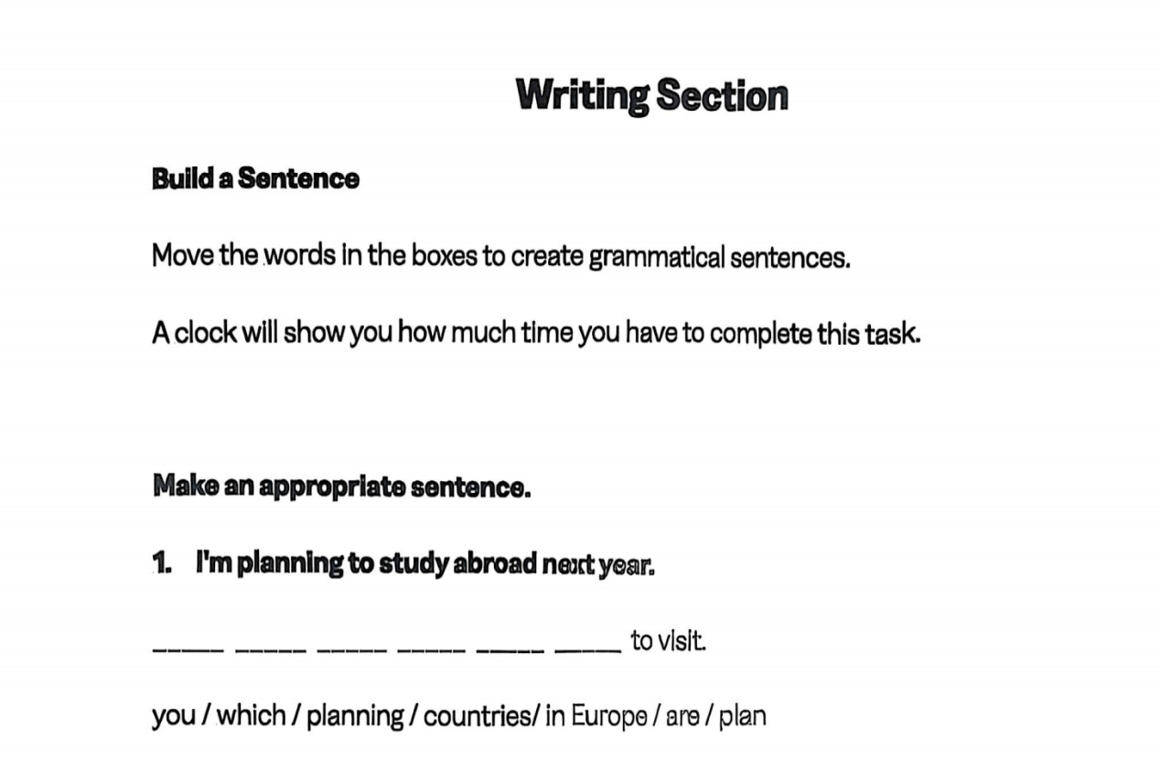 新增题型①:构建句子(Build a Sentence) 给出一组乱序单词和背景提示,需要按语法规则排序成完整句子。比如提示“描述学生上课”,给出单词“students / in / are / class”,排序为“Students are in class”。重点考语法基础和句子逻辑。