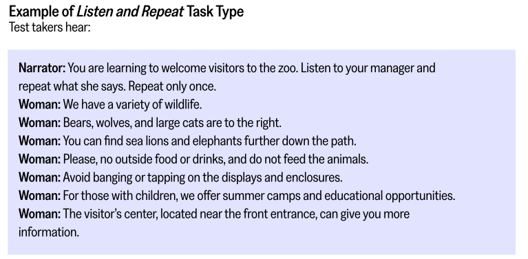 任务①:倾听并重复(Listen and Repeat) 听一句生活场景的句子(无文字显示),听完后即时复述。有点像“跟读模仿”,重点考发音准确性和短时记忆能力,对发音好的同学很友好。