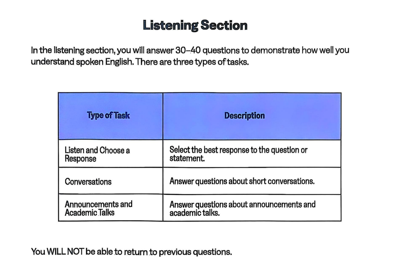 新增题型:倾听并选择答案(Listen and Choose a Response) 播放一句日常场景的提问或陈述(比如“Could you pass the salt?”),需要从选项中选最自然的回应。不仅考听力理解,还考口语表达的语境适配性,有点像“听力版口语交际”。场景优化 短对话时长压缩至30秒左右,聚焦点餐、校园事务、社交闲聊等日常场景;学术讲座也精简到100-250词,重点考核心观点抓取,不再纠结细节记忆。
