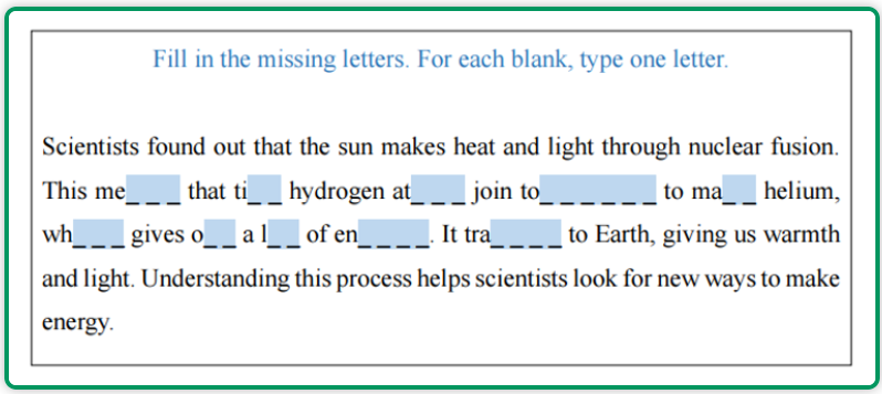 真实语料中截取,从第二句第二个单词起设置空缺,每空截取该单词的后半部分,考生填写对应字母拼出完整单词,总10空。